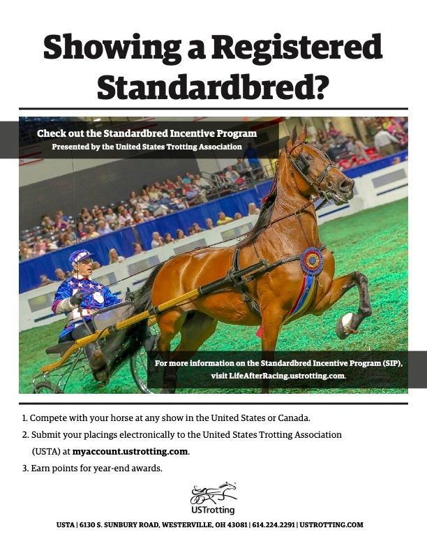 In 2022, the USTA launched SIP, the Standardbred Incentive Program, which recognizes Standardbreds participating in disciplines other than racing. Riders and drivers who take a registered Standardbred to a show or endurance ride submit results to accumulate points for year-end awards.
