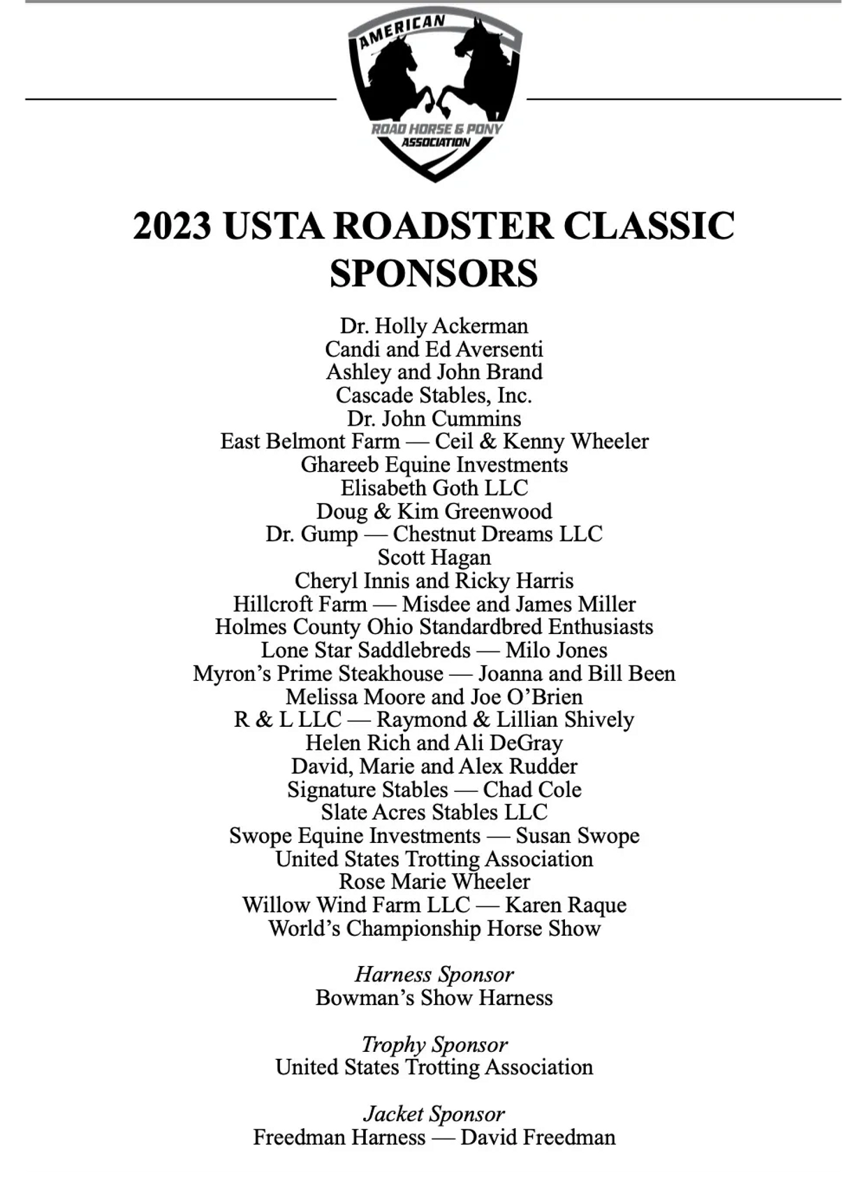 WCHS Entry: Horse must be entered by the owner/trainer in the WCHS in the USTA Roadster Classic class by WCHS entry deadline. Rules of the ARHPA and WCHS will apply.